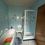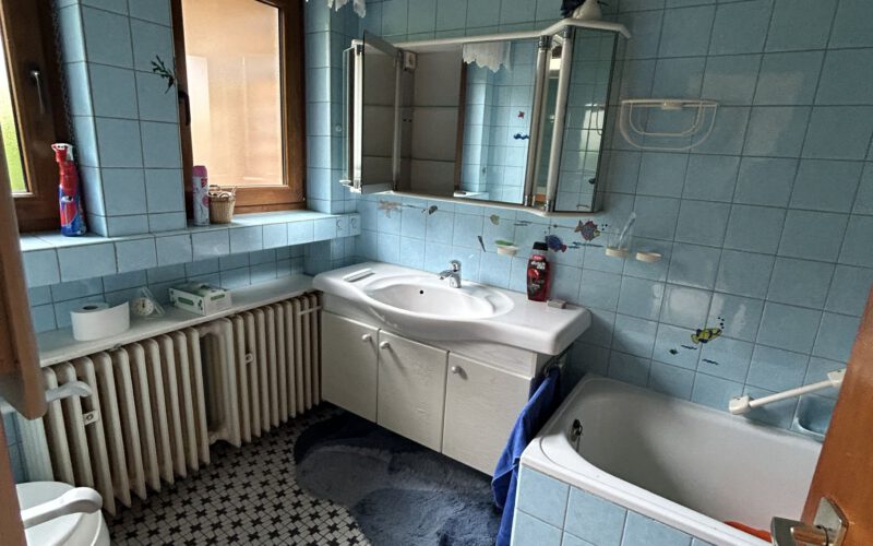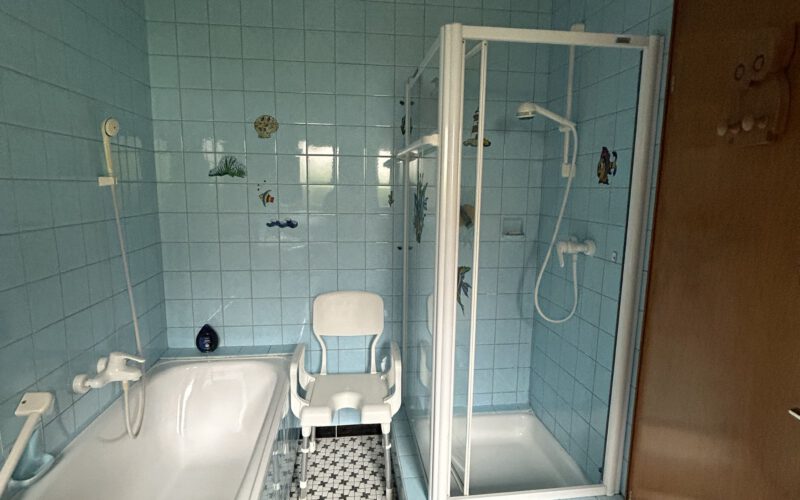 Das Badezimmer mit Badewanne und Dusche ist altersentsprechend mit Tageslichtfenster.