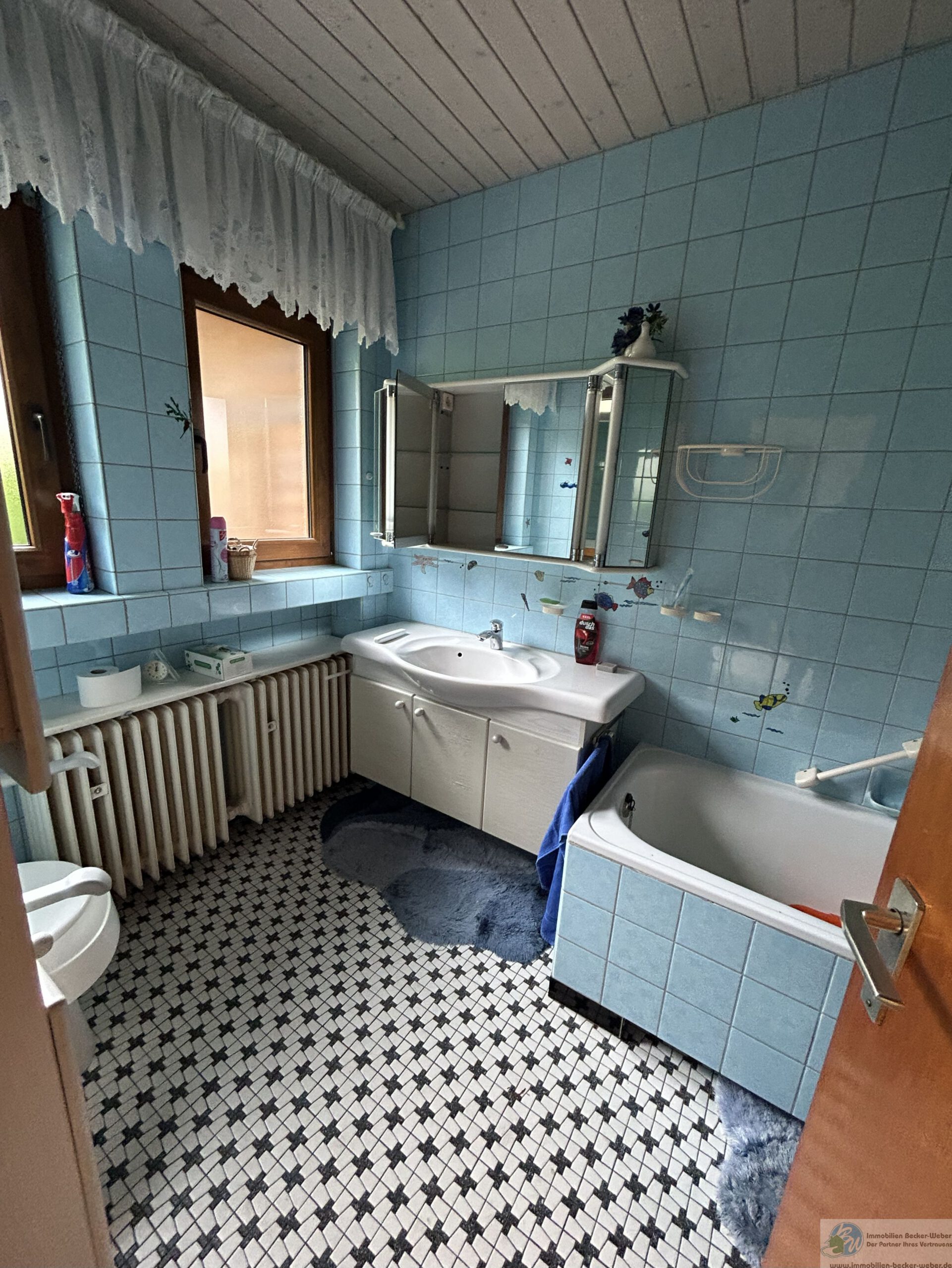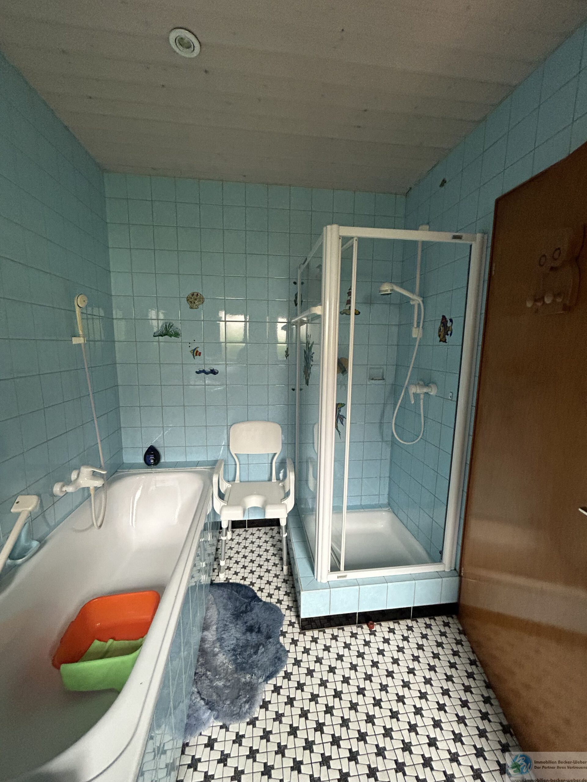 Das Badezimmer mit Badewanne und Dusche ist altersentsprechend mit Tageslichtfenster.
