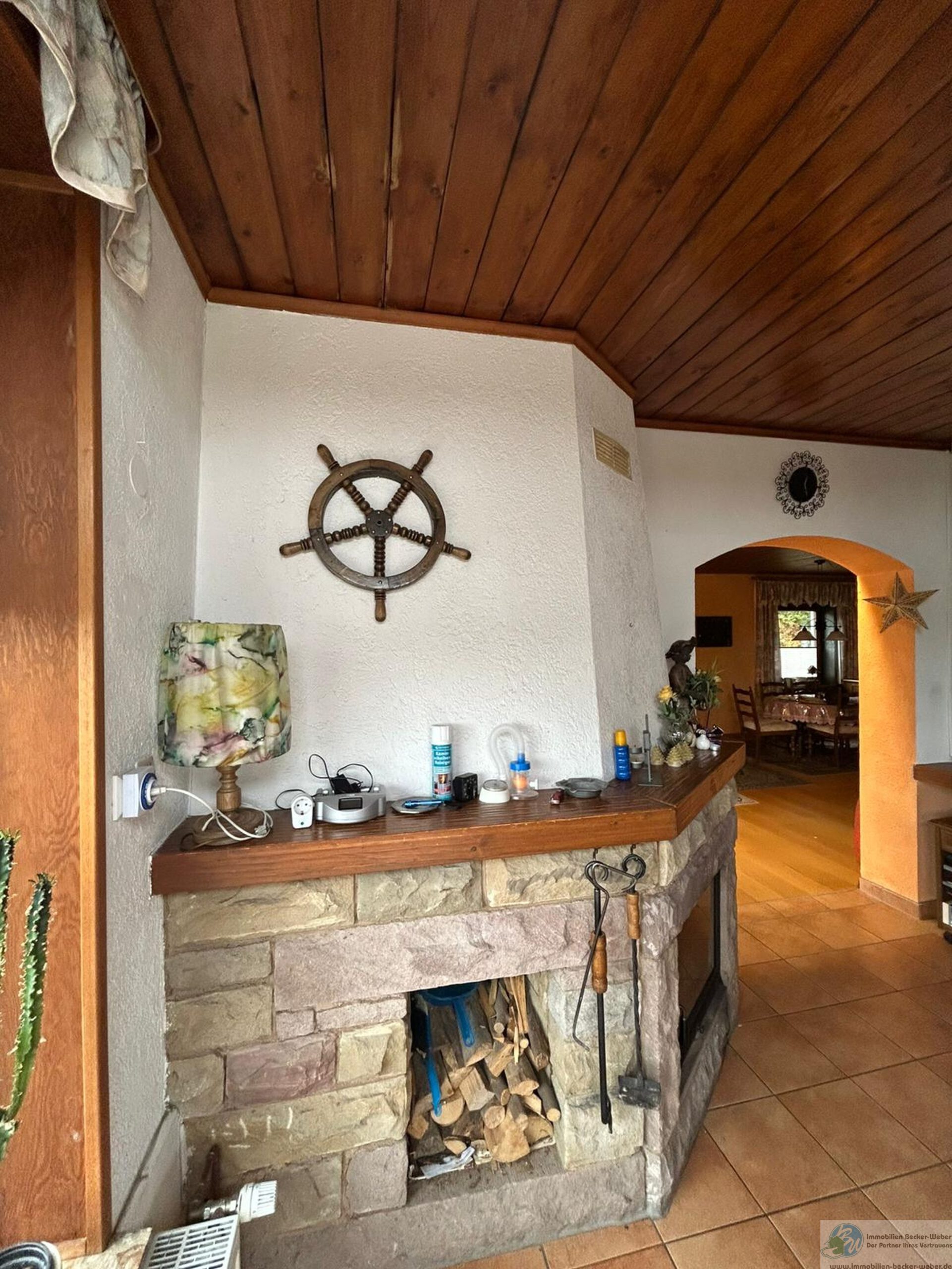 In dem Wintergarten befindet sich ein offener Kamin. Hier ist ein direkter Zugang auf die umlaufende Terrasse möglich.